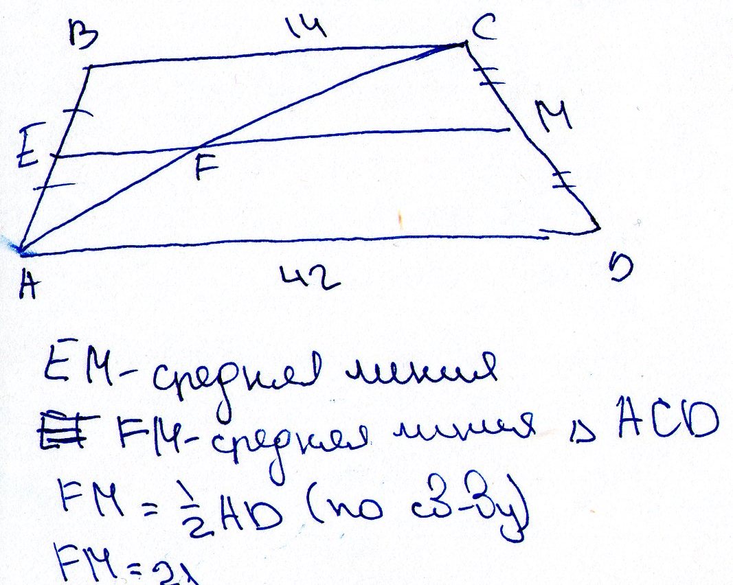 Основание трапеции равны 14 и 42.Найдите больший из отрезков,на которые делит среднюю линию этой трапеции одна из диагонале.