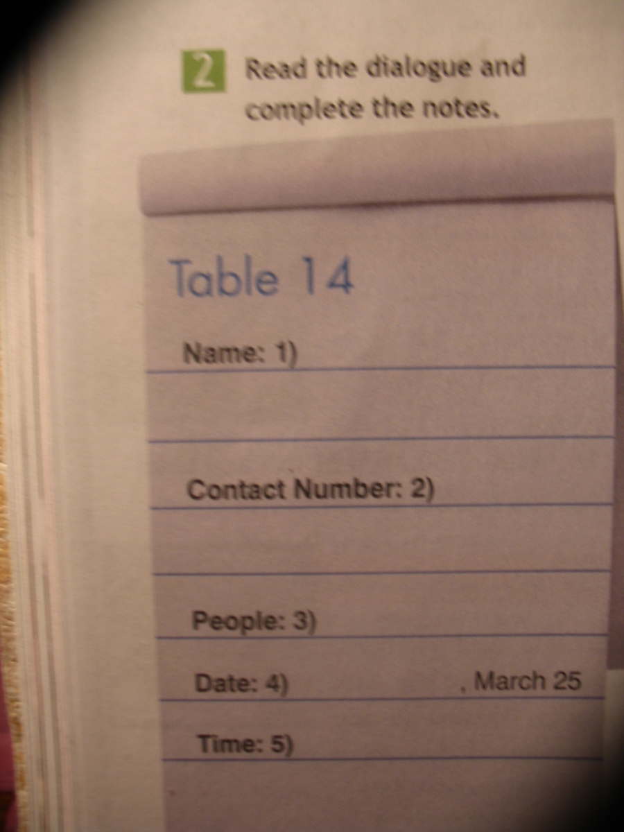 Прочитайте диалог и заполните строчки(скорее всего строчки,переведи в переводчике это слово). 1)Имя.2)Контактный телефон.3)Люди.4)Дата ,Март 25.5)Время