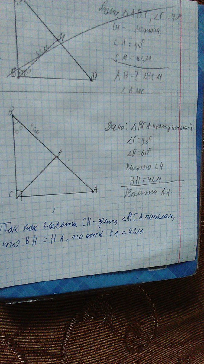Дан прямоугольный тр-к ВСА. угол С- прямой, угол В=60 градусов. Из угла С проведена высота СН к стороне ВА. ВН=4см. Найдите сторону АН. Помогите пожалуйста!!!!