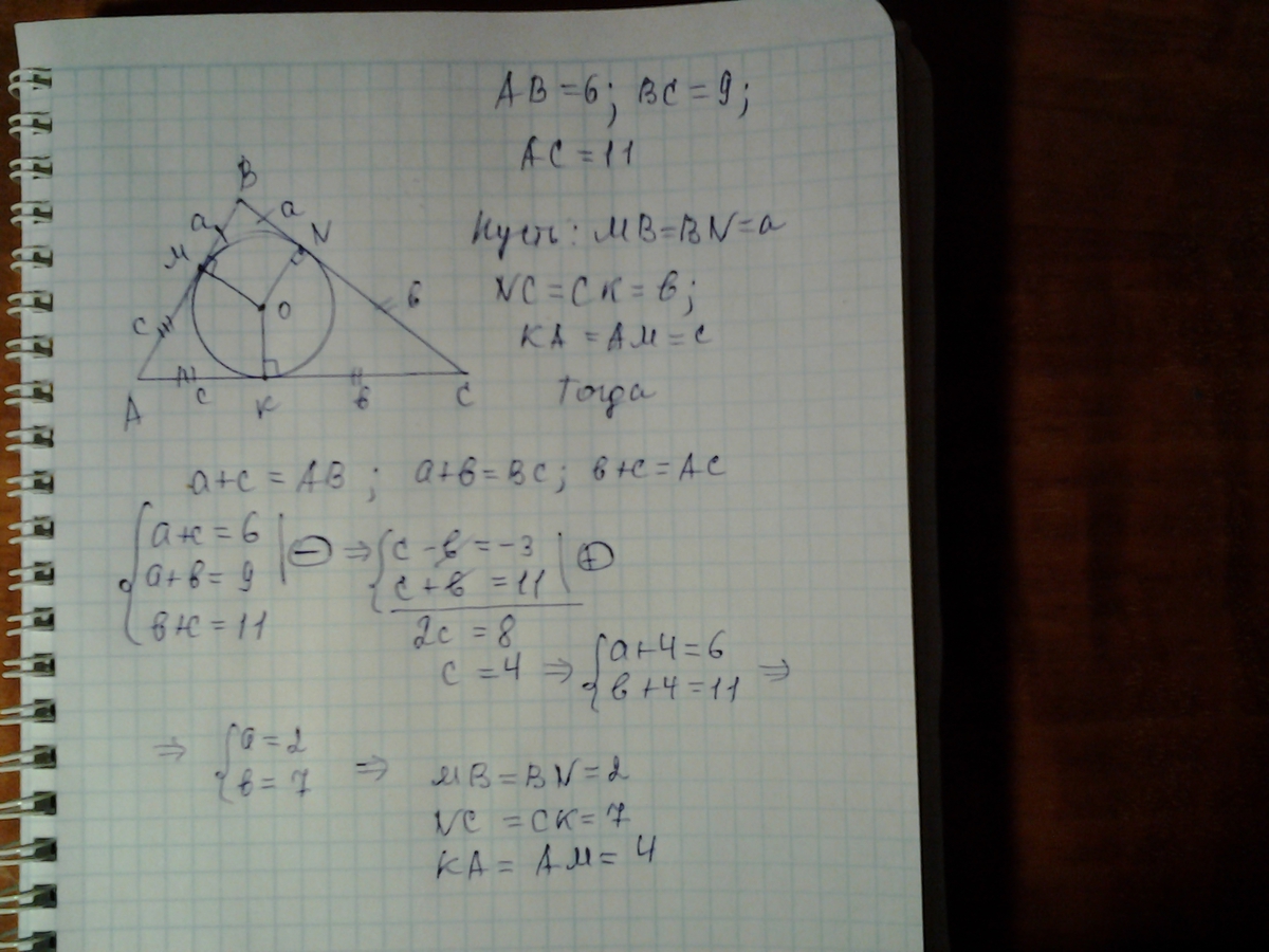 В треугольник, стороны которого равны 6,9,11, вписана окружность. Найдите длины отрезков этих сторон, на которые они делятся точками касания с вписанной окружностью