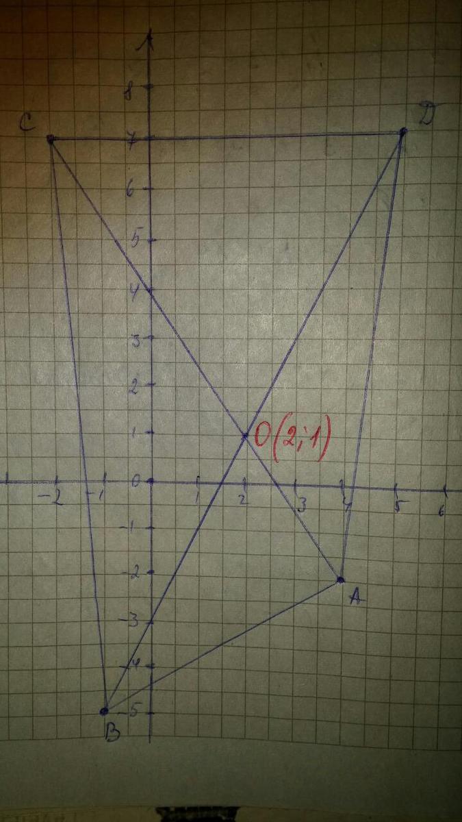 Постройте на координатной плоскости четырехугольник ABCD с вершинами A(4:-2)B(-1:-5)C(-2:7)D(5:7)и проведите его диагонали.Какие координаты имеет точк