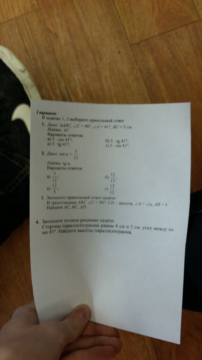 1) BC/AC=tg ∠A=tg 41°. Отсюда AC=BC/tg 41°=5/tg 41°