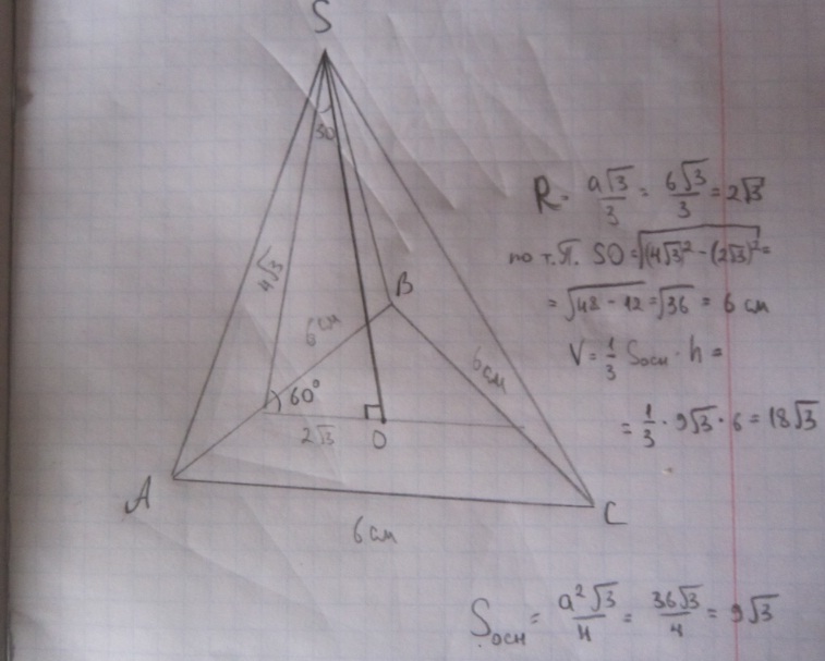 Сторона основи правельної трикутньої призми 6см, а двохгранний кут рри основі 60° знайти об'єм піраміди