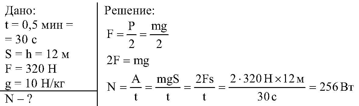 ящик с кирпичами был поднят с помощью подвижного блока на высоту 12 м за 0,5 мин.чему равна мощность,развитая при подъёме ящика,если величина приложенной силы равна 320 Н