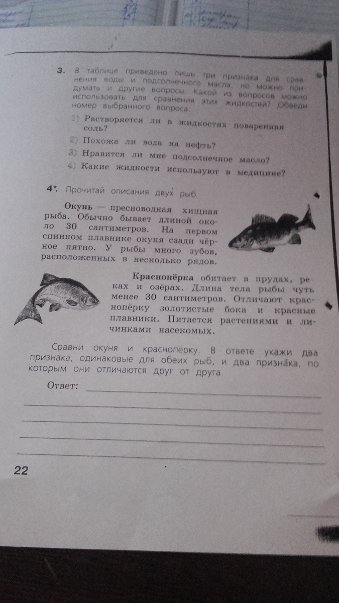 Красноперка и окунь - травоядные рыбы и пресноводные.Разные у них размеры и цвета.Окунь полосатый, у окуня верхний плавник колючий