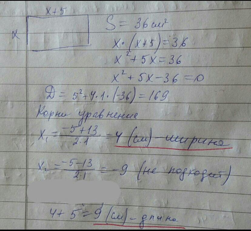 Длина прямоугольника на 5см больше ширишь ,а его площадь равна 36см2 . Найдите стороны прямоугольника