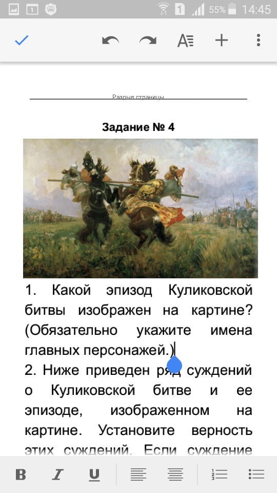 1. Какой эпизод Куликовской битвы изображен на картине? (Обязательно укажите имена главных персонажей.)