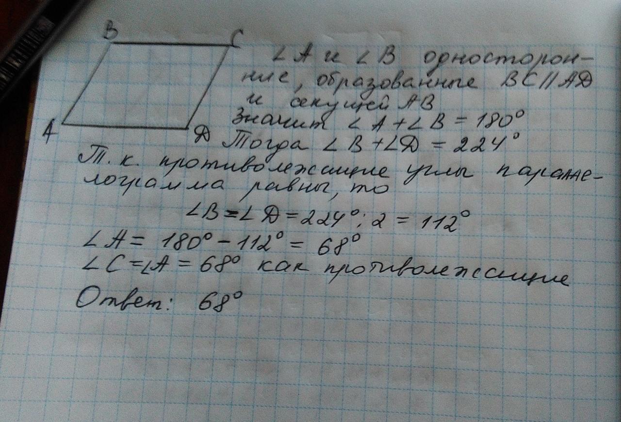 сумма двух углов параллелограмма равна 224 градусов. найдите один из оставшихся углов.. ответ дайте в градусах.