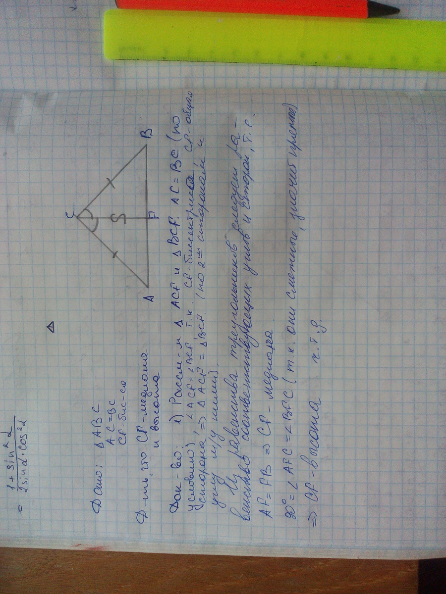 Докажите, что в равнобедренном треугольнике биссектриса, проведенная к основанию, является медианой и высотой. 25 БАЛЛОВ!!!