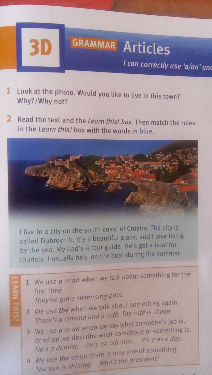 Я живу в городе южнее от (города) Кроатиа(я). Этот город назван Дубровник . Это прекрасное место, и я люблю жить (возле) около океана. Мой папа экскурсовод. Он имеет много (толпы) туристов. Я всегда ему помогаю когда разгар лета.