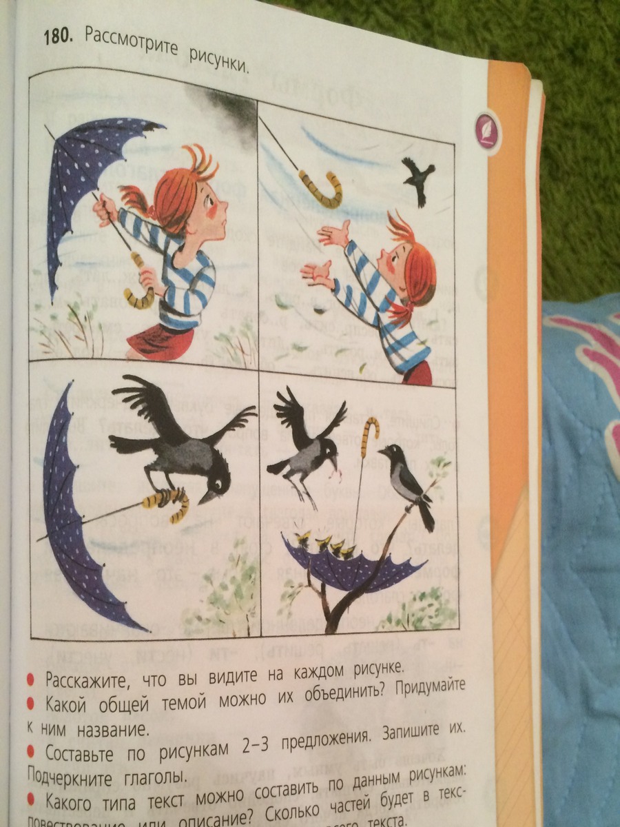 Маша гуляла с зонтиком. Вдруг к ней подлетела ворона, она схватила зонтик. Ворона полетела с ним на дерево и положила как гнездо. Туда поселилась воронья семья.