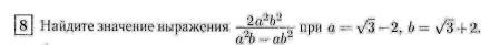 frac{2a^2b^2}{a^2b-ab^2}=frac{2a^2b^2}{ab(a-b)}=frac{2ab}{a-b}a=sqrt{3}-2 ;b=sqrt{3}+2; frac{2ab}{a-b}=frac{2*(sqrt{3}-2)*(sqrt{3}+2)}{sqrt{3}-2-sqrt{3}-2}=frac{-2}{-4}=-0,5