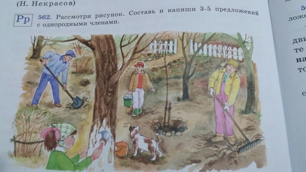 мальчик помогает наводить порядок,девочка белит дерево,собака наблюдает как все работают