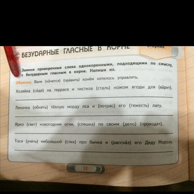 1) Хозяйка сидела на террасе и чистила стальным ножом ягоды для варенья (наверное, в этом слове не уверена, но другое подобрать не могу). 2) Леночка обняла тёплую морду пса и потрясла его тяжёлую лапу. 3) Ярко светили новогодние огни, смешили по своим делам прохожие. 4) Тося учил небольшой стишок про бычка и рассказывал его Деду Морозу.