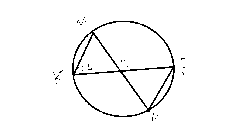 Пусть MN и KF - диаметры окружности с центром в точке O. Угол MKF равен 38 градусов Найдите угол FON Ответ дайте в градусах