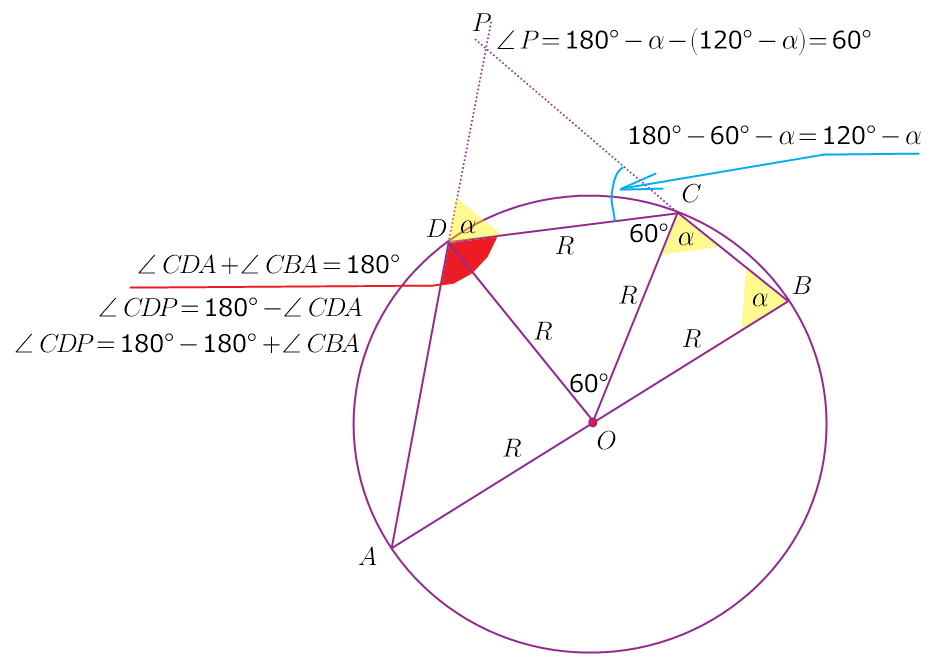 вершины четырехугольника ABCD расположены на окружности причем сторона AB является диаметром , а противолежащая ей сторона CD равна радиусу Найти угол между продолжением двух других сторон