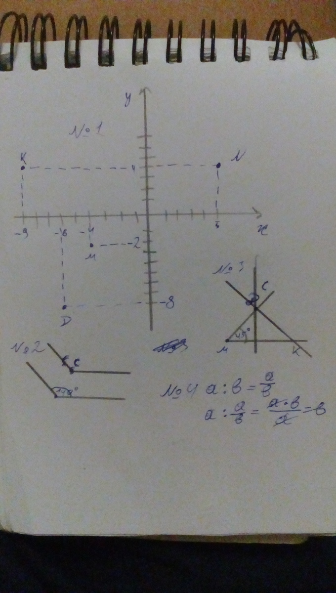 №1 Отметьте на координатной плоскости точки M (-4;-2) N (5;4) K (-9;4) D (-6;-8) №2 Постройте угол,равный 140°, и отметьте внутри него точку.Проведите через эту точку прямые,параллельные сторонам угла. №3 Постройте ∠CMK=45°.Отметьте на стороне MK точку D и проведите через неё прямые,перпендикулярные сторонам угла CMK№4 Делимое равно a, а делитель равен b ( a и b не равны нулю).Каков будет результат,если разделить делимое на частное этих чисел.