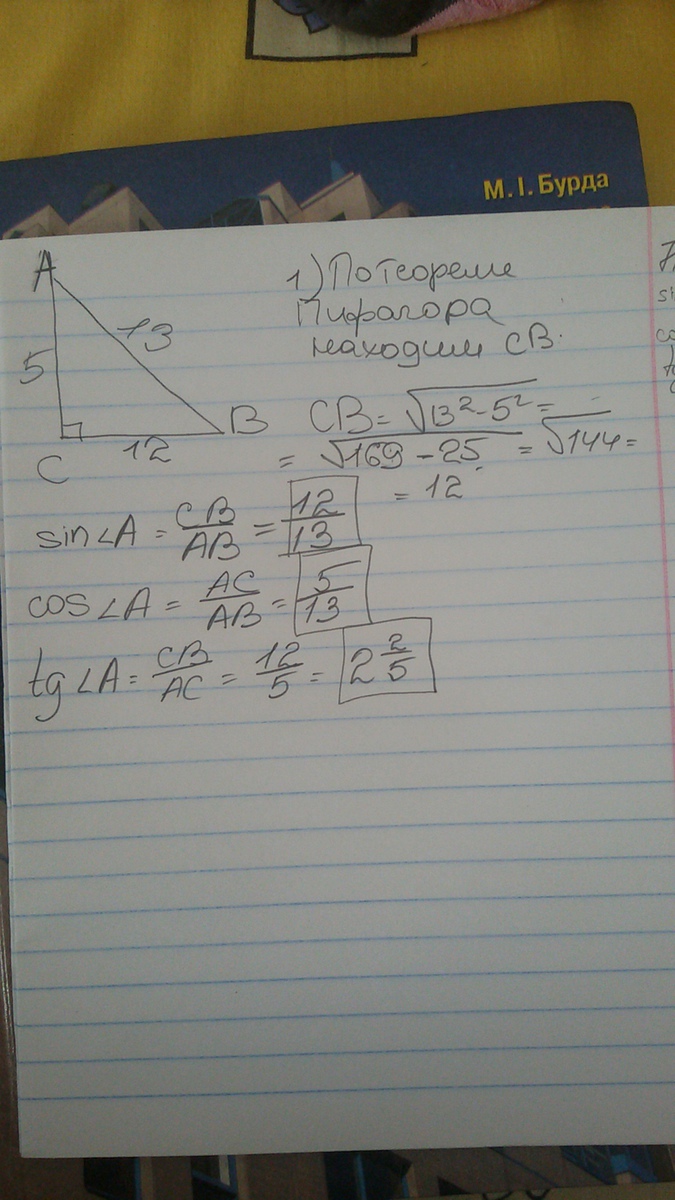 В прямоугольном треугольнике АВС (угол С = 90 градусов) АВ=13 см,АС=5см.Найти синус А, косинус А, тангекс А.