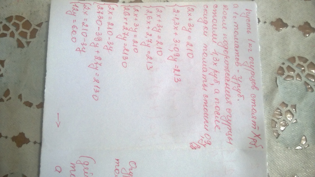 за 2 килограмм огурцов и 3 грамм томатов заплатить 210 руб. если огурцы подорожают на 30% а помидоры подешевеют на 10% то за такое же количество продуктов будет уплачено 213 руб. Сколько стоит один кг каждого продукта?