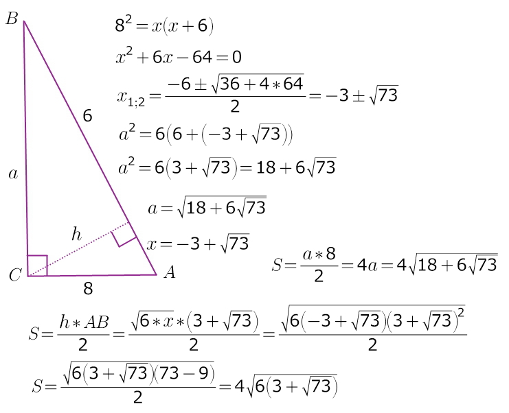 катет=среднему геометрическому своей проекции на гипотенузу и все гипотенузы: a² = a_c * c, b² = b_c * с