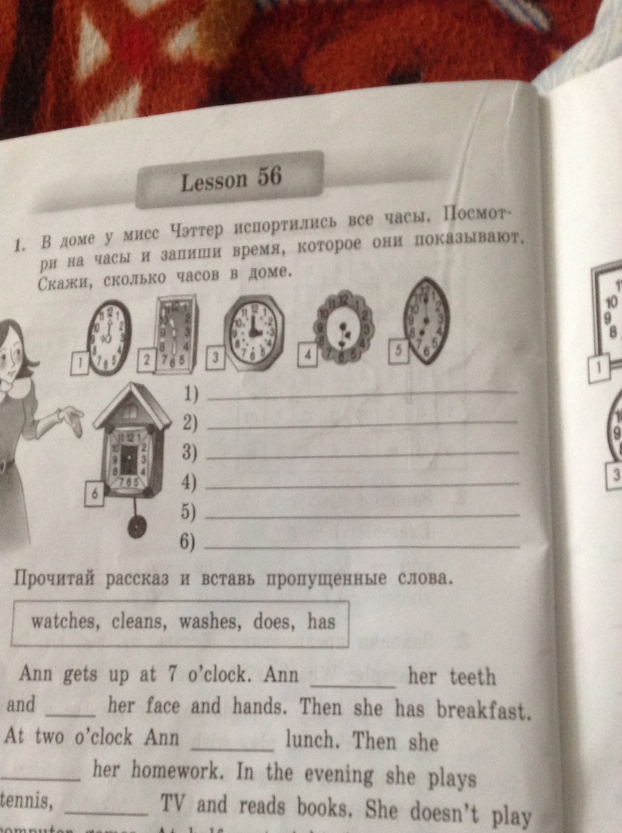 1 nine o'clock 2 half past ten 3 three o'clock 4 half past four 5 seven o'clock 6 half past nine