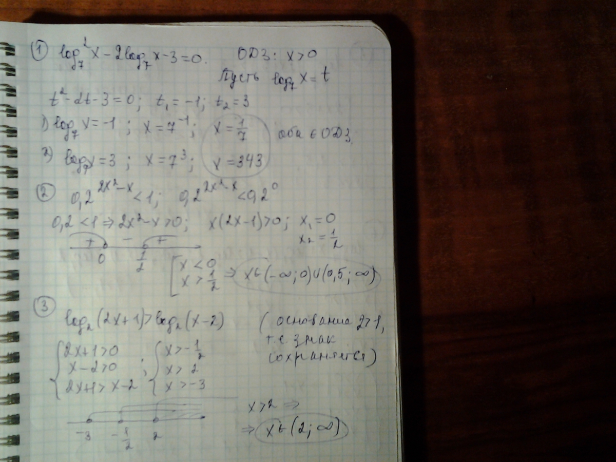 1.Пусть Log7 x=t тогда имеем t^2-2t-3=0 t[1]=3 t[2]=-1.