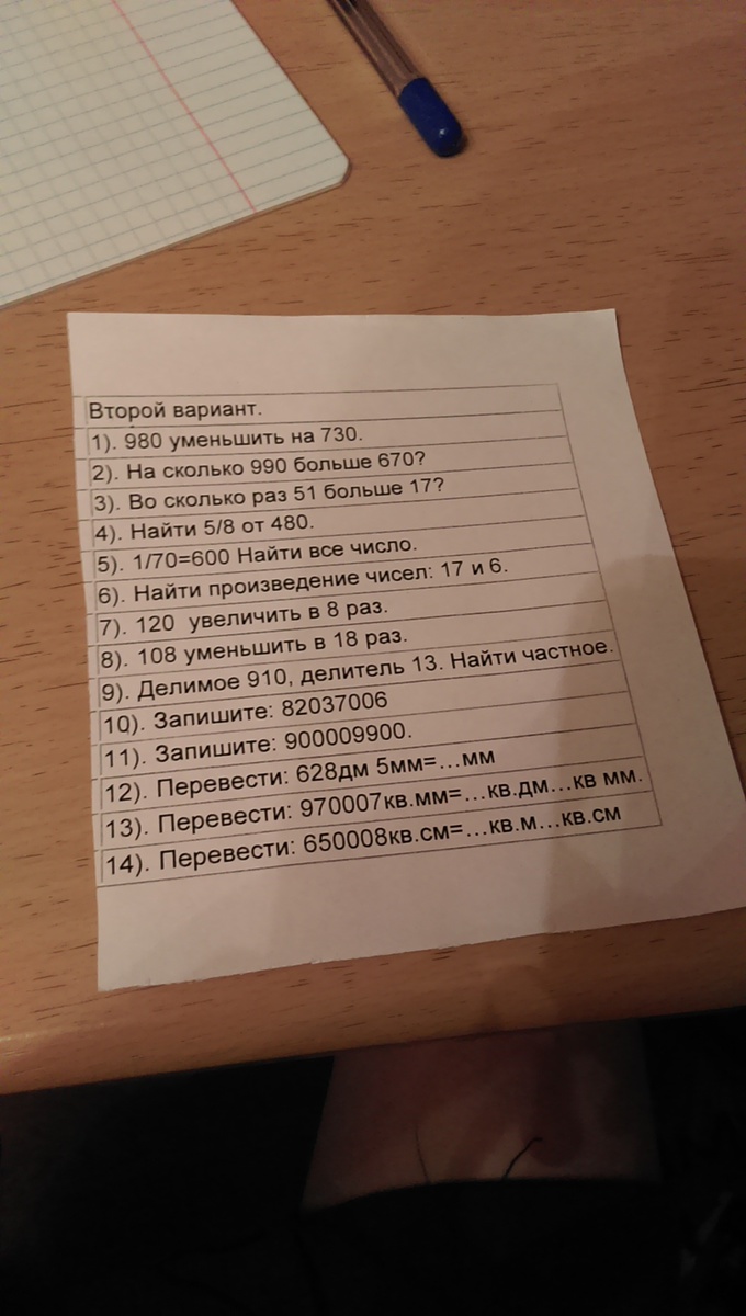 1)980-730=250<br />2)990-670=320<br />3)51/17=3<br />4)480*5/8=300<br />6)17*6=102<br />7)120*8=960<br />8)108/18=6<br />9)910/13=70<br />12)62805мм