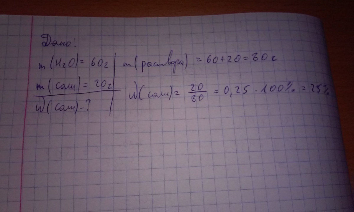 вычислите массовую долю растворенного вещества в растворе полученном при растворении в 60 г воды 20 г соли. (Запишите Дано, найти и решение, все подробно! Если не знаете не пишите!)