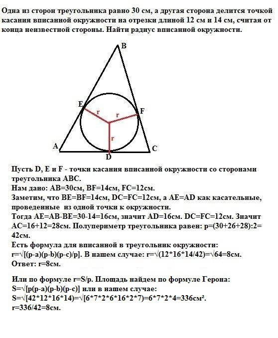 Одна из сторон треугольника равно 30 см, а другая сторона делится точкой касания вписанной окружности на отрезки длиной 12 см и 14 см, считая от конца неизвестной стороны. Найти радиус вписанной окружности.