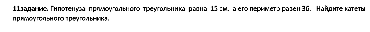 Гипотенуза прямоугольного треугольника равна 15 см, а его периметр равен 36. Найдите катеты прямоугольного треугольника. НУЖНО С РЕШЕНИЕМ!!!