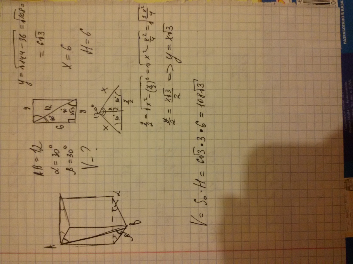 основанием поямой треугольной призмы является равнобедренный треугольник с углом 30°при основании. Диагональ боковой грани призмы, которая содержит боковую сторону основания равна 12 см. и наклонена к плоскости основания под углом 30°. найти V призмы. Пожалуйста, помогите, сама не могу решить. прошу, помогите.