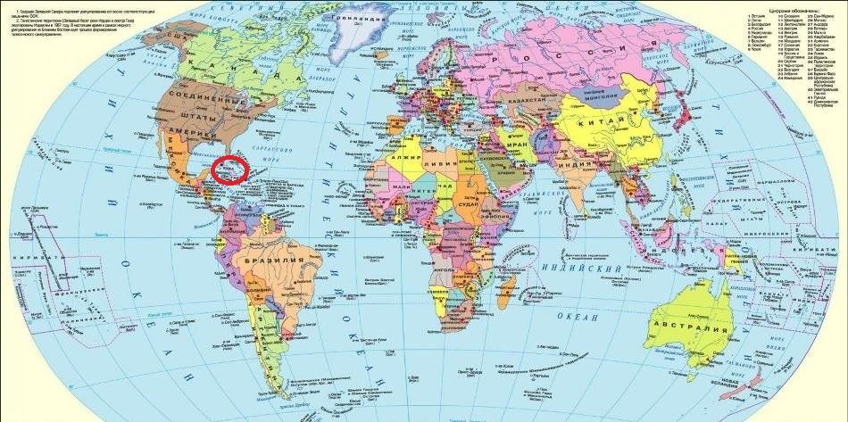 Если мы посмотрим на карту, которая дана ниже в приложении, то увидим, что Куба расположена в Северном и Западном полушариях.