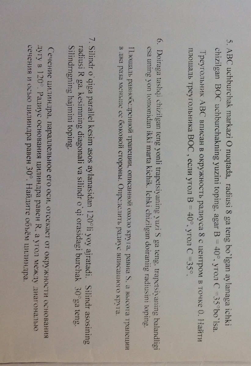 1.Треугольник ABC вписан в окружность радиуса 8с центром в точке O.Найти площадь треугольника BOC,если угол B=40,угол С=35.