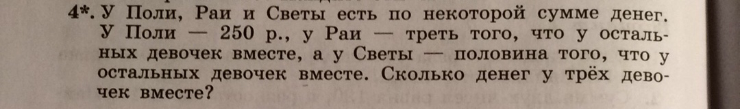 Пошли Ран и Светы есть по некоторой сумме денег У Пошли 250 у Рати — треть того что у сталь юных девочек вместе а у Светы — половина того что у остальных девочек вместе Сколько денег у Древо чек вместе