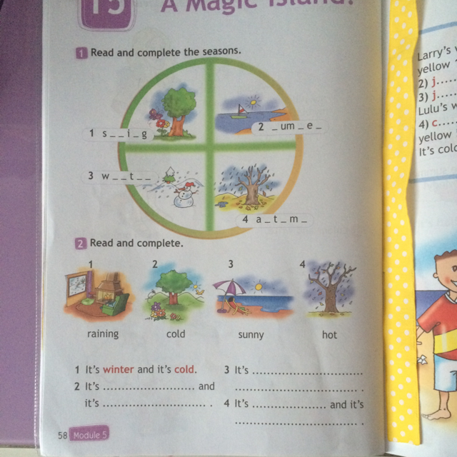 1 Задание 1.spring 2.summer 3.winter 4. autumn 2) Задание 2 It's warm and It's sunny. 3) It's autumn and It's raining 4) It's fog and It's hot