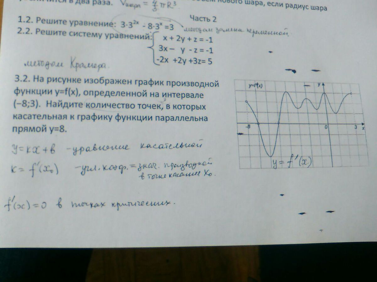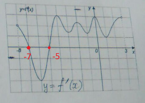 На рисунке изображен график производной функции y=f(x), определенной на интервале (-8;3).Найдите количество точек, в которых касательная к графику функции параллельна прямой y=8