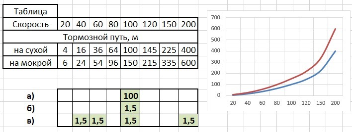 помогите решить задачу по математике за 4 класс. в таблице указана длина тормозного пути автомобиля на сухой и на мокрой дороге в зависимости от его скорости. а)каков тормозной путь автомобиля,двигающегося со скоростью 100 км/ч по сухой дороге?б)во сколько раз увеличивается тормозной путь.если автомобиль движется с той же скоростью по мокрой дороге?в)сохраняется ли это отношение,если автомобиль движется со скоростью 40 км/ч?со скоростью 60 км/ч?со скоростью 200 км/ч? в таблице скорость:20.40.60.80.100.120.150.200;тормозной путь, на сухой дороге:4.16.36.64.100.145.225.400на мокрой дороге:6.24.54.96.150.215.335.600