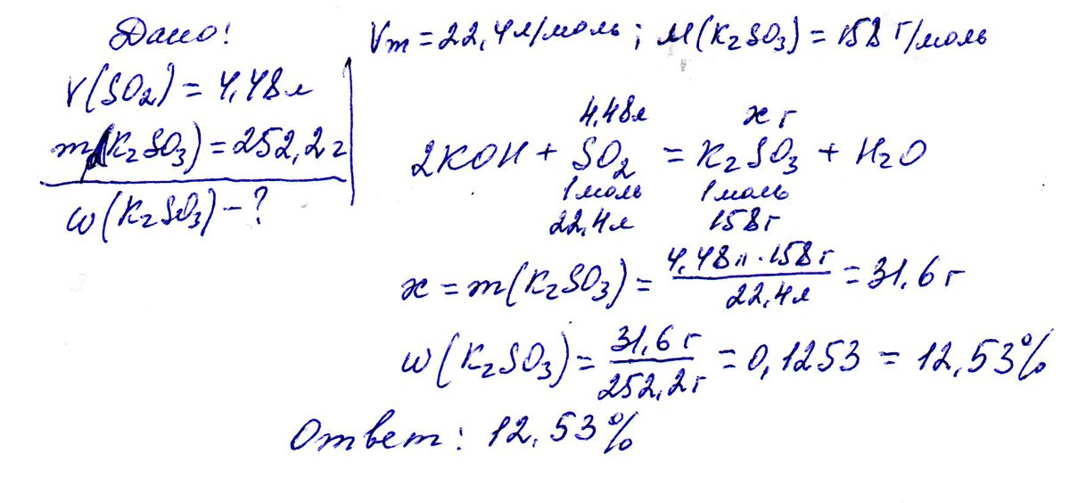 через раствор гидроксида калия пропустили 4.48 л сернистого газа (н.у) получили 252.2 г раствора сульфита калия. Вычислите w% cоли в полученном растворе