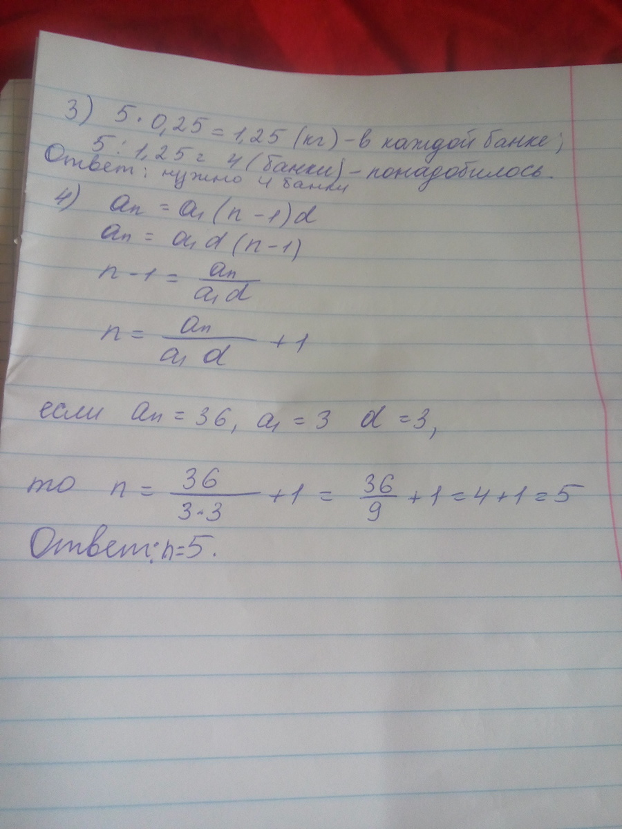 3. 4 банки, т.к. 25%*4=100% (значит все 5 кг поместятся)