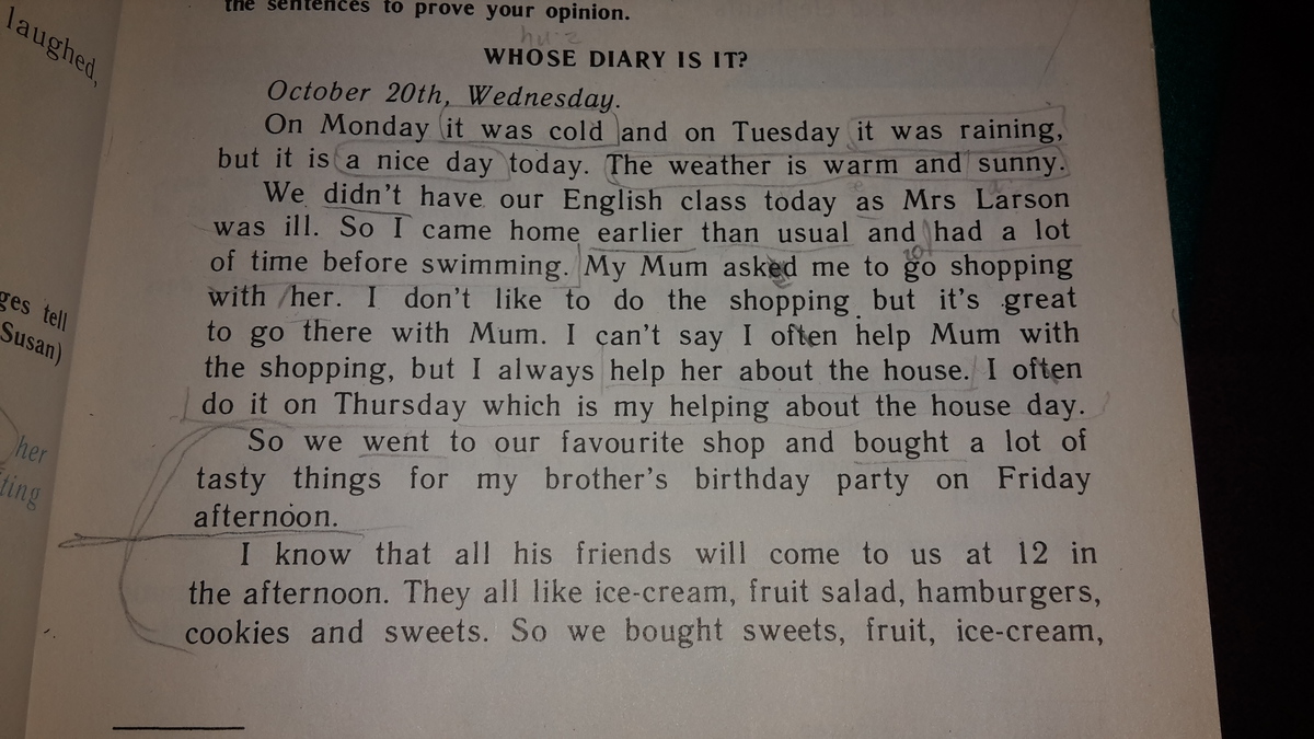 У нас не было английского урока сегодня , потому что мистер Ларсон заболел. Вот почему я пришёл домой необычно рано и у меня было много времени до плавания. Моя мама сказала пойти с ней за покупками. Я не люблю ходить за покупками, но это хорошо проходить с мамой. Я не могу сказать , что частно хожу за покупками с мамой, но я всегда помогаю ей по дому. Я всегда делаю во вторник когда моя очередь убирать.