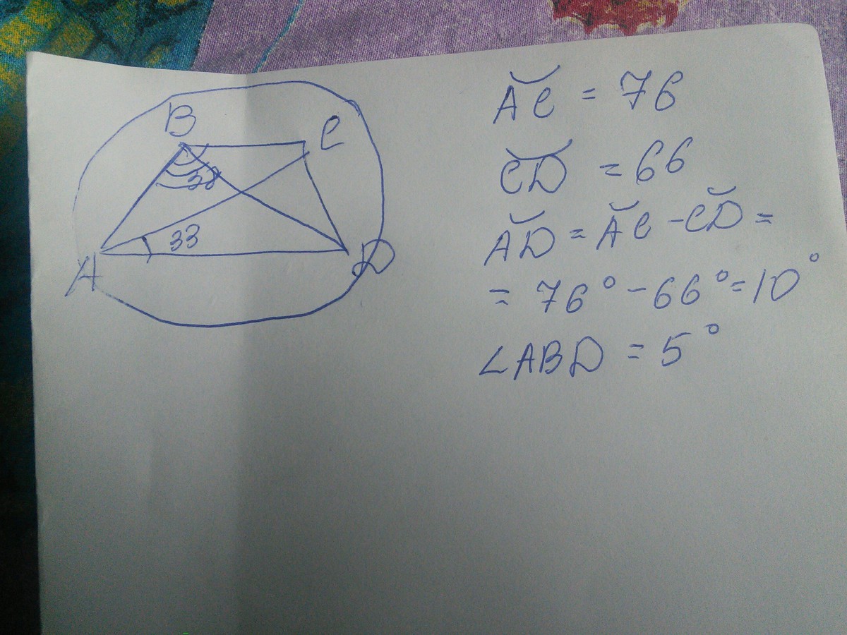 АВС=38,известно что величина дуги на который опирается выписанный в окружность угол имеет градусную меру вдвое больше чем градусная мера угла,то есть длина дуги АС=76, CAD=33 следовательно CD=66,нас интересует градусная мера АВD достроили его.