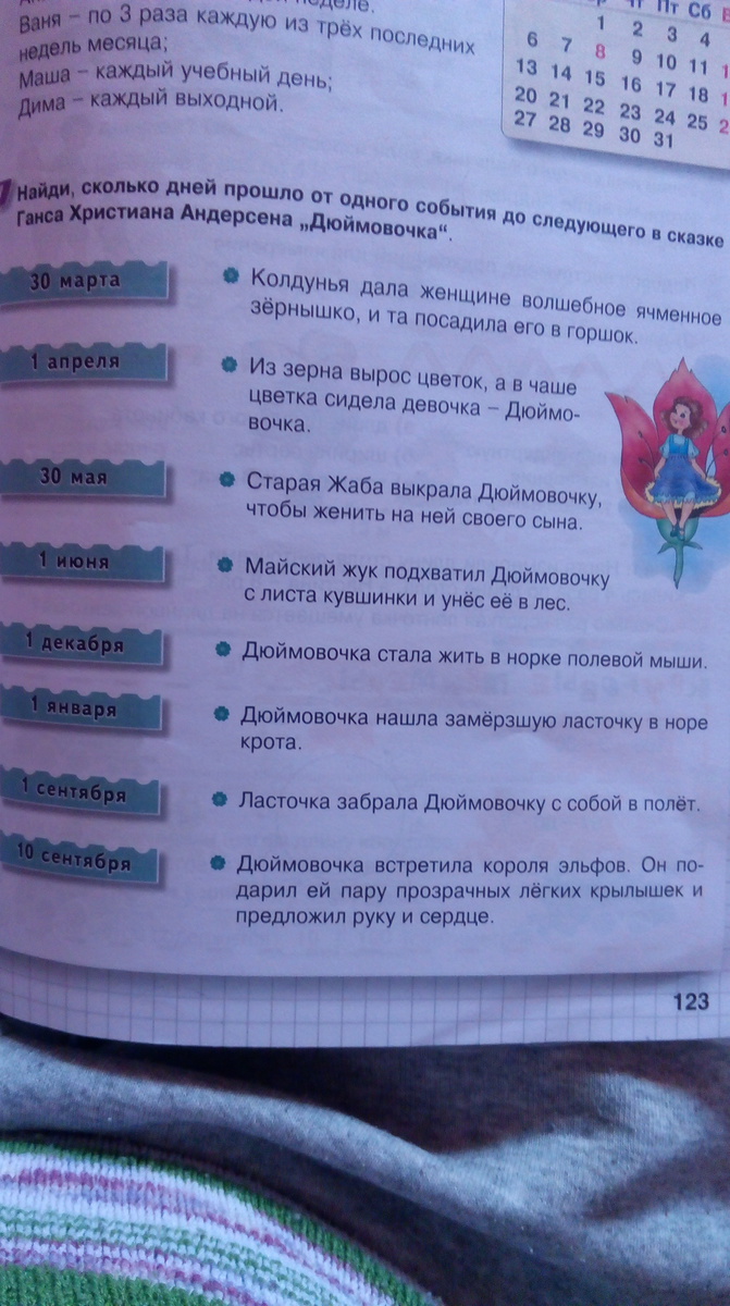 найди, сколько дней прошло от одного события до следующего в сказке Ганса Христиан а Андерсена "Дюймовочка"
