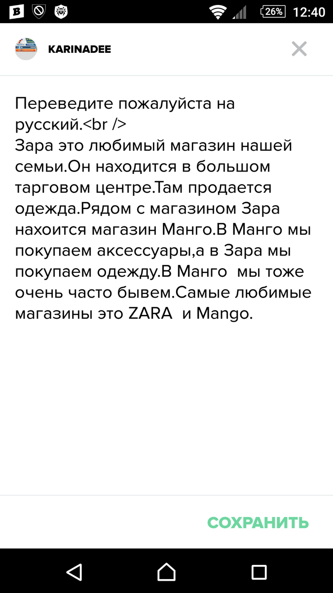 ZARA is a favorite shop of our family. It is located in a large shopping center. There sold clothes. Next to shop ZARA shop Mango. At Mango we buy accessories and in ZARA we buy clothes. Mango, we too are very often. The most favorite stores is ZARA and Mango