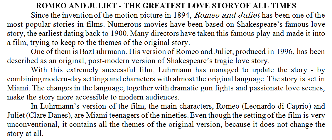 С появлением кинопроизводства в 1894 году , Ромео и Джульетта стала самой популярной экранизацией . Бессметное количество фильмов были сняты на на основе знаменитой Шекспировской любовной истории , самая ранняя из которых была снята 1900. Многие кинопродюсеры брали за основу эту пьесу и снимали фильмы , стараясь придерживаться основным идеям оригинала . Одним из таких кинопродюсеров был Баз Лурман . Его версия Ромео и Джульетта была выпущена 1996 году , описываемая как оригинальная , пост модернисткая версия Шекспировской любовной трагедии . Лурман сумел модернизировать столь крайне успешный , самодостаточный фильм , комбинируя современной обстановкою и главными героями говорящими на оригинале языка .История разворачивается в Майами. Изменения в языке вместе с драматическими сценами и схватками с огнестрельным оружием и страстными любовными сценами , сделали фильм сделали более восприимчивым для современной аудитори. В версии Лурмана , главными героями являются подростки 90 х годов , Ромео в исполнении Леонардо ДиКаприо и Джульетта в исполнении Клары Дейнс . Не смотря на , то что постановка истории не условна и не меняет при этом совсем так как она содержит все основы оригинала истории.