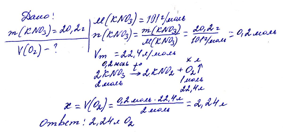 при разложении из двух моль нитрата калия получается 1моль кислорода.