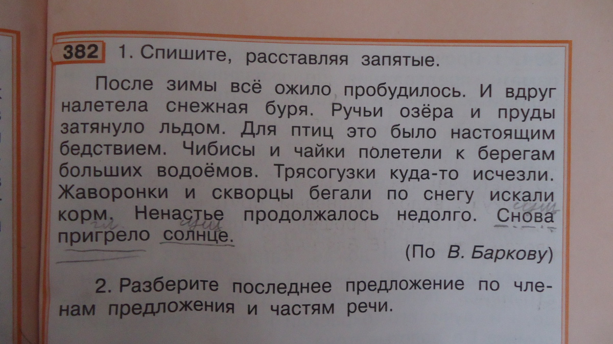 После зимы все ожило, пробудилось. И вдруг налетела снежная буря. Ручьи, озера и пруда затянуло льдом. Для птиц это было настоящим бедствием. Чибисы и чайки полетели к берегам больших водоемов. Трясогузки куда-то исчезли. жаворонки и скворцы бегали по снегу, искали корм. Ненастье продолжалось недолго. Снова пригрело солнце.
