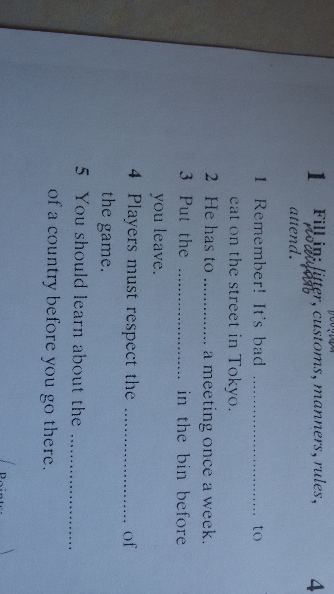 1) manners 2) attend 3) litter 4) rules 5) customs