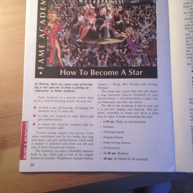 Великобритании, есть много способов Nevem- певцов Стинг, Бой Джордж и Джордж Инг с Саар и Āne гм Гэмин образование Майкла в Fame Academy. В доме есть шикарный мяч с мягкими стульями, огромный танцзал (Коралева Елезавета II когда-то Fame Academy является популярным реалити-шоу танцевала там), студия звукозаписи, тренажерный зал, Люкс-комплект в своего рода интернат. Ее цели Уры спальни и чилл-аут комнаты Жизнь в Академии не так просто и найти новое все-танцы, все-петь звезды это не просто петь и танцевать. Экзаменую- от 18 до 35 лет. Расписание вмятины "является жестким и есть немного, чтобы обучать студентов петь, танцевать и время для игры. Это выглядит примерно так: давать спектакли: 6:30 утра Проснись и завтрак следить за прогрессом студентов и посмотреть, насколько хорошо они справляются уроки танцев Двенадцать молодых певцов chosea от многих участников и в течение десяти недель они поют Уроки пения и танцев и давать спектакли , Каждую неделю написания песен уроки студент отчисляется до трех не осталось, и один из них становится победителем. Академия занимает красивый особняк, построенный в 1920-х годах и является одним из крупнейших 11:00 вечера Bedtime домов в Лондоне. Соседи включают в себя знаменитый Al дни будет снят на 49 camerast 26