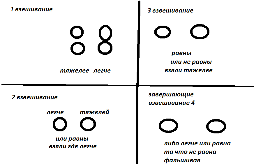 известно что одна из четырех монет фальшивая, но неизвестно, легче она или тяжелее настоящих. За какое минимальное количество взвешиваний на чашечных весах без гири можно определить фальшивую монету? Решение задачи по действием!
