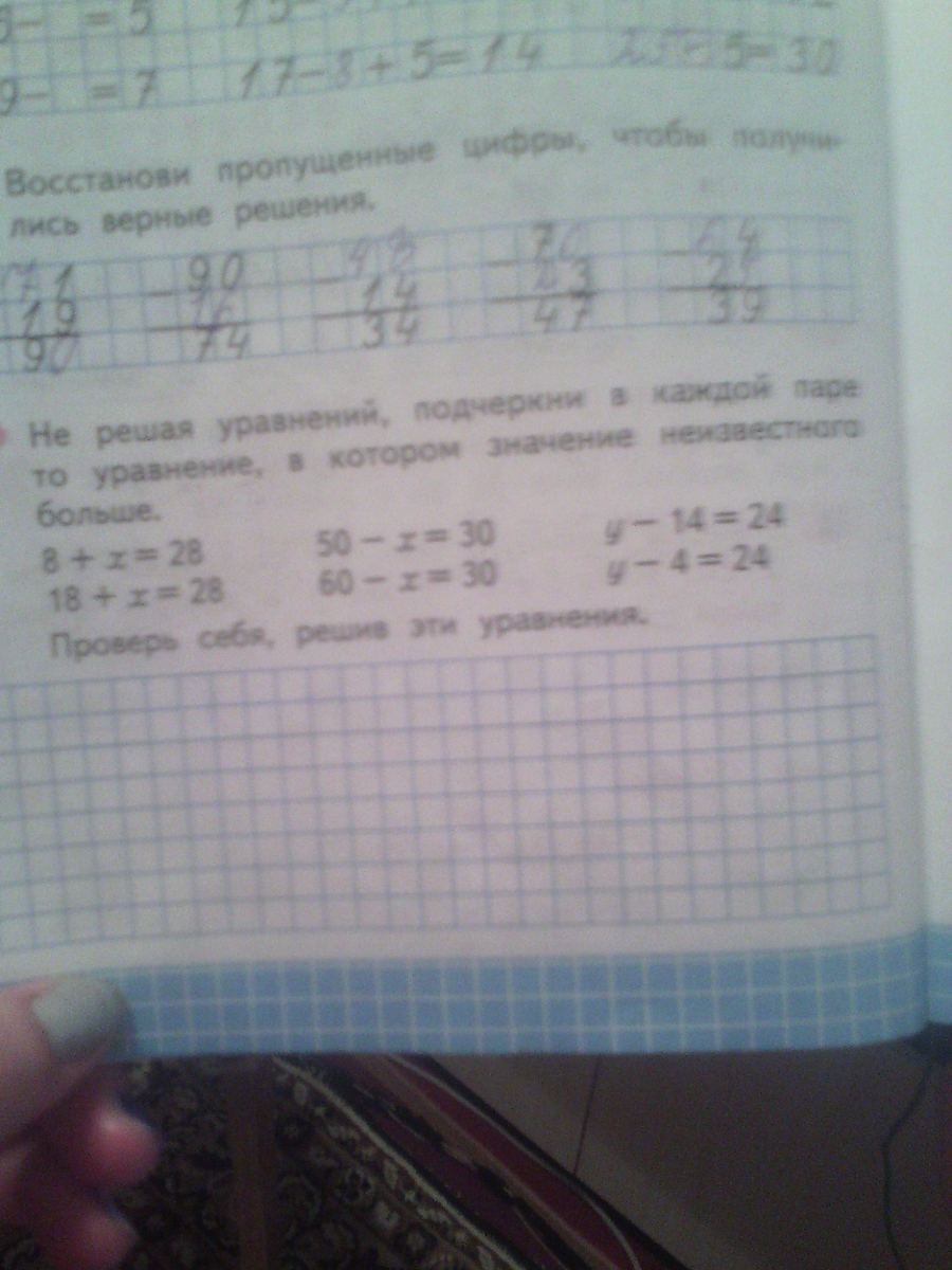 не решая уравнений подчеркни в каждой паре то уравнение в которых значения неизвестного больше
